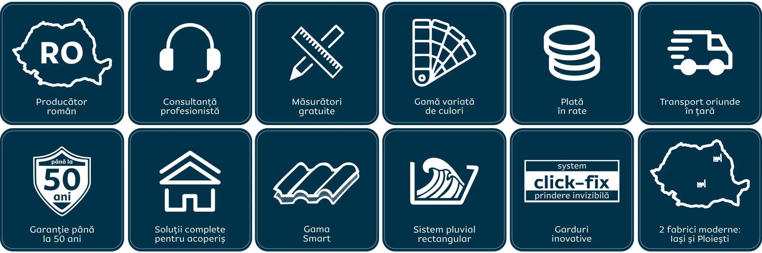 În cele două fabrici moderne din Iași și Ploiești producem sisteme complete de acoperișuri metalice, garduri metalice și soluții dedicate atât construcțiilor rezidențiale, cât și celor industriale. Portofoliul nostru cuprinde peste 250 de produse, disponibile într-o gamă largă de culori și finisaje, oferind libertate de configurare și unitate vizuală pentru fiecare proiect.