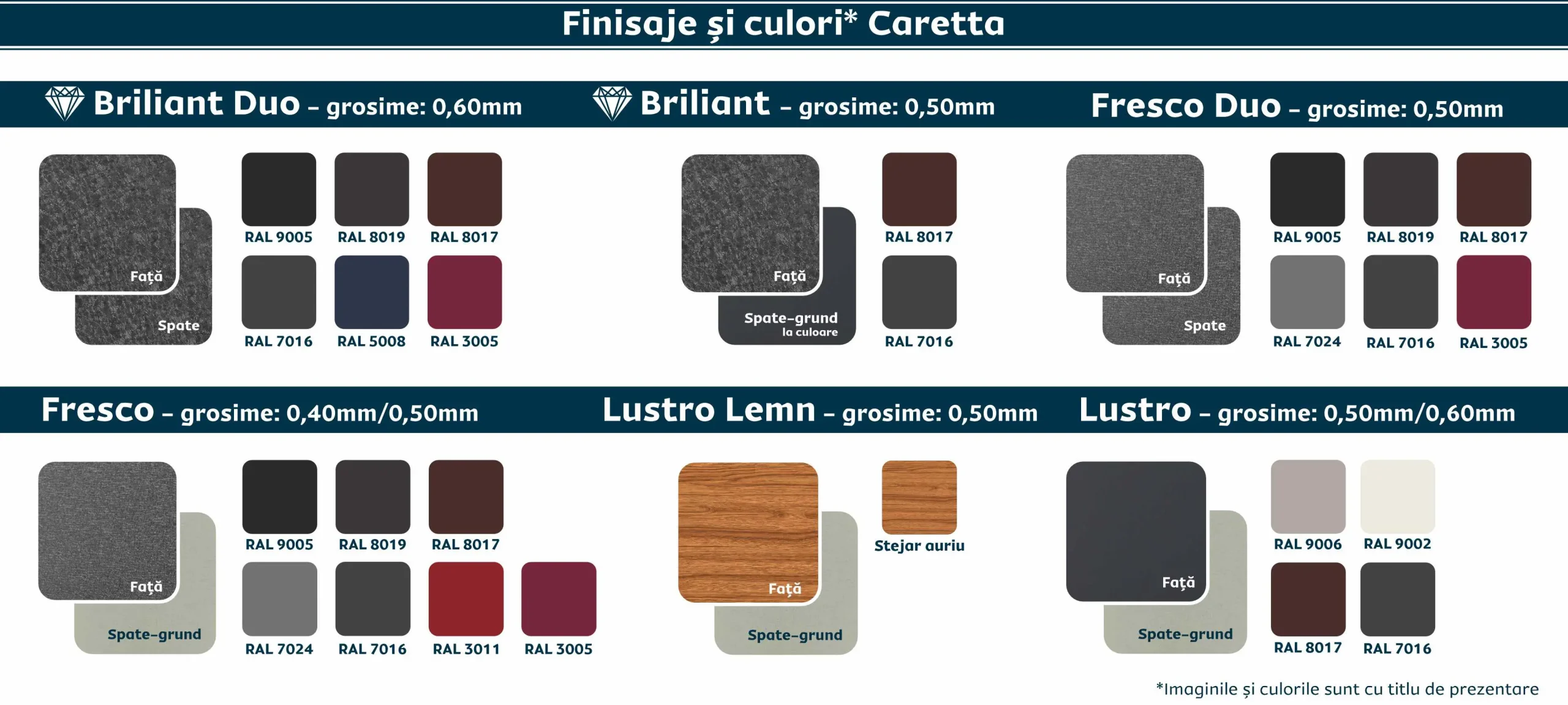 Oferim o mare diversitate de culori (peste 24 nuanțe) și finisaje (Briliant Duo/Briliant, Fresco Duo/Fresco și Lustro Duo/Lustro), adecvate pentru țiglă metalică, garduri, sistem pluvial și accesorii. Asigurăm compatibilitate coloristică între diverse categorii de produse și garantăm rezistența la UV.