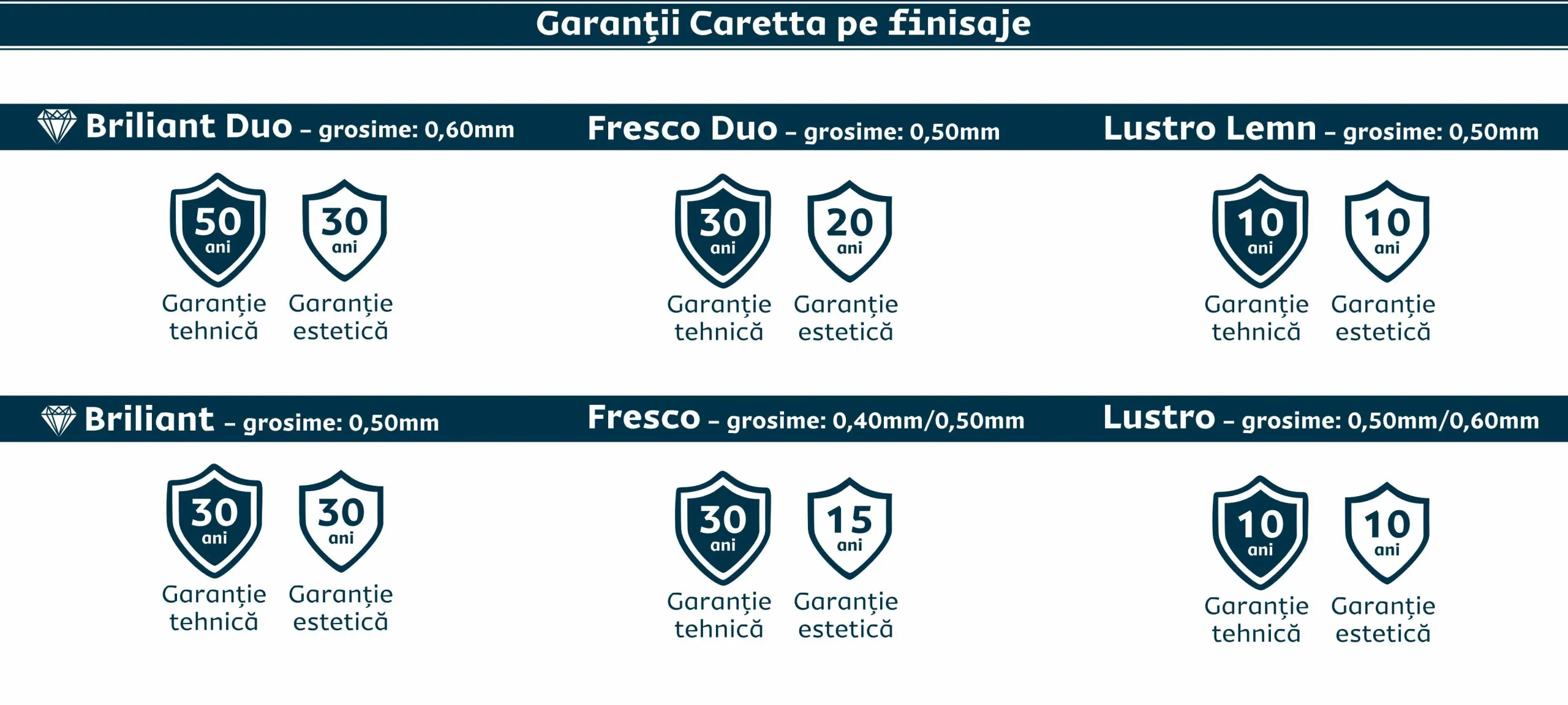 Oferim garanții comerciale de până la 50 de ani pentru acoperișuri și garduri metalice, în funcție de tipul de produs și categoria de finisaj aleasă. Aceste garanții reflectă calitatea materialelor, a tehnologiei de fabricație și a controlului riguros al producției. Ca producător, garantăm performanța și durabilitatea produselor.