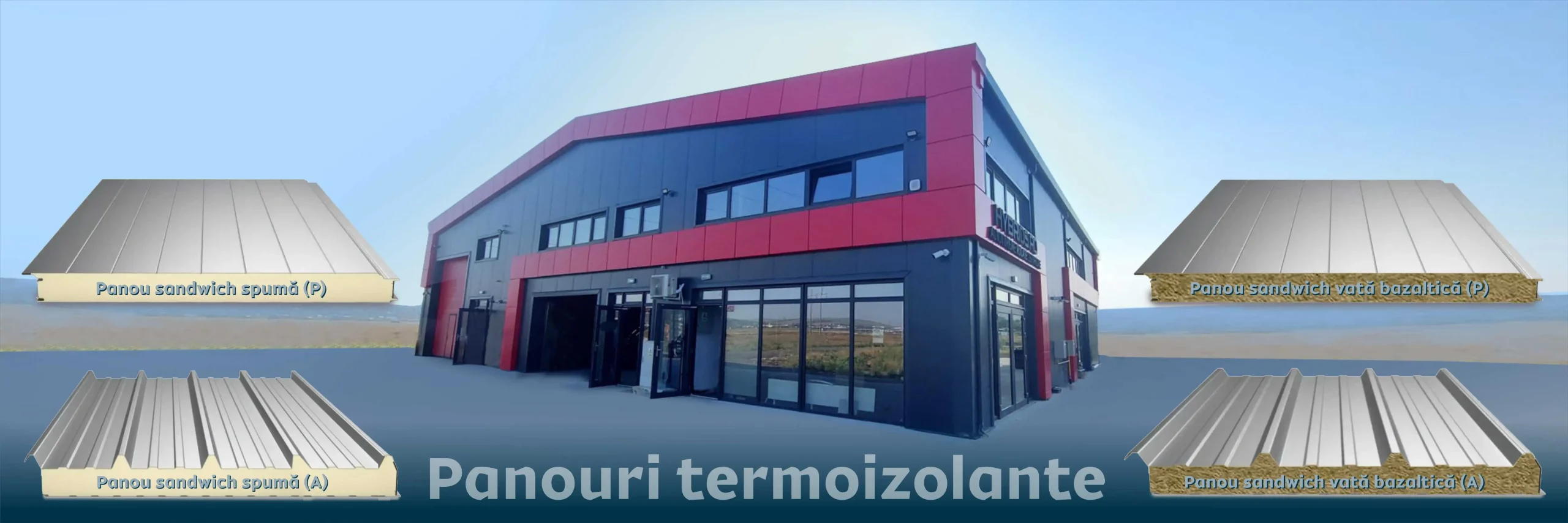 Panourile termoizolante sandwich pentru perete (P) sunt elemente prefabricate utilizate pentru închiderea eficientă a clădirilor industriale (inclusiv incinte frigorifice), comerciale sau rezidențiale. Sunt alcătuite din două fețe din oțel galvanizat și vopsit, cu miez termoizolant din PUR sau PIR, asigurând rigiditate, etanșeitate și performanță termică ridicată. Față de panourile pentru acoperiș, au profil adaptat montajului vertical și pot avea prindere vizibilă (montaj rapid, cost optim) sau prindere ascunsă (aspect uniform, estetic).