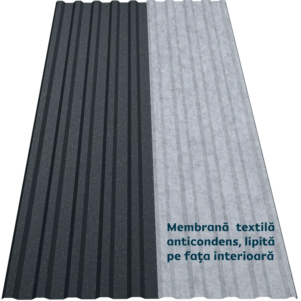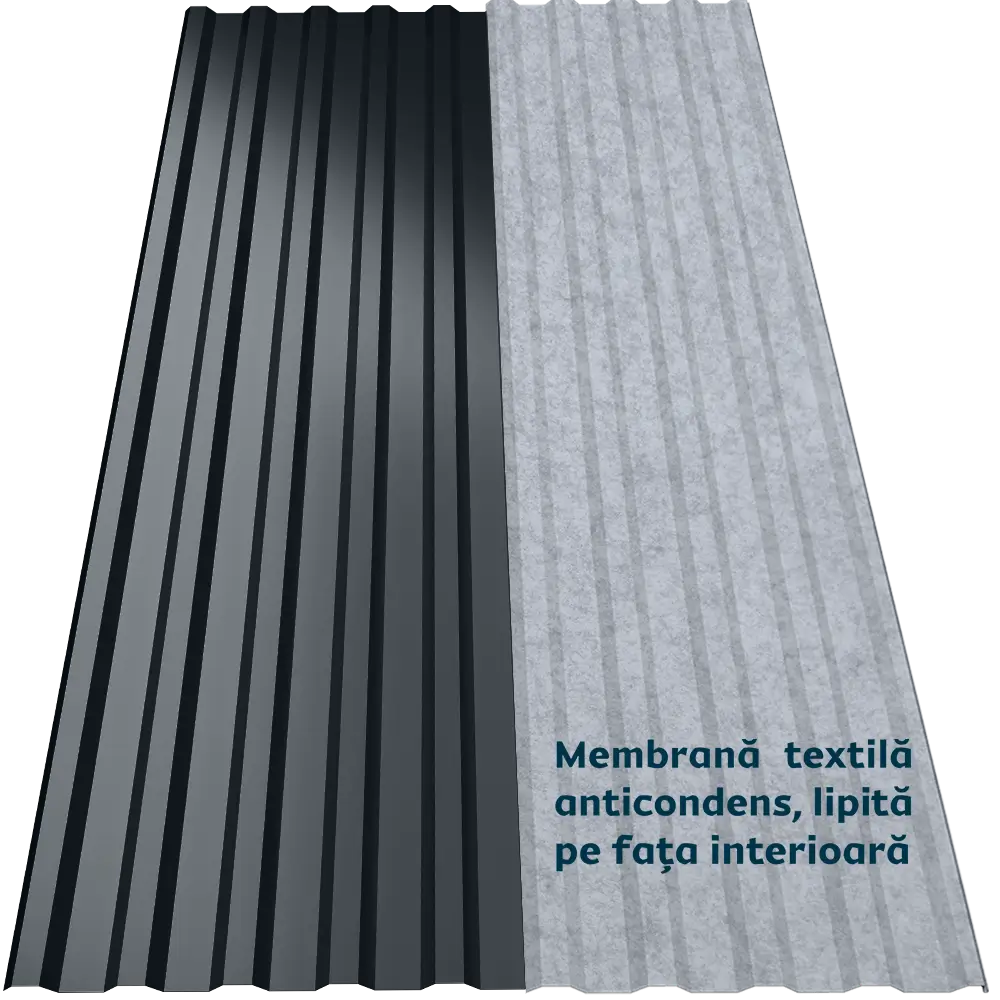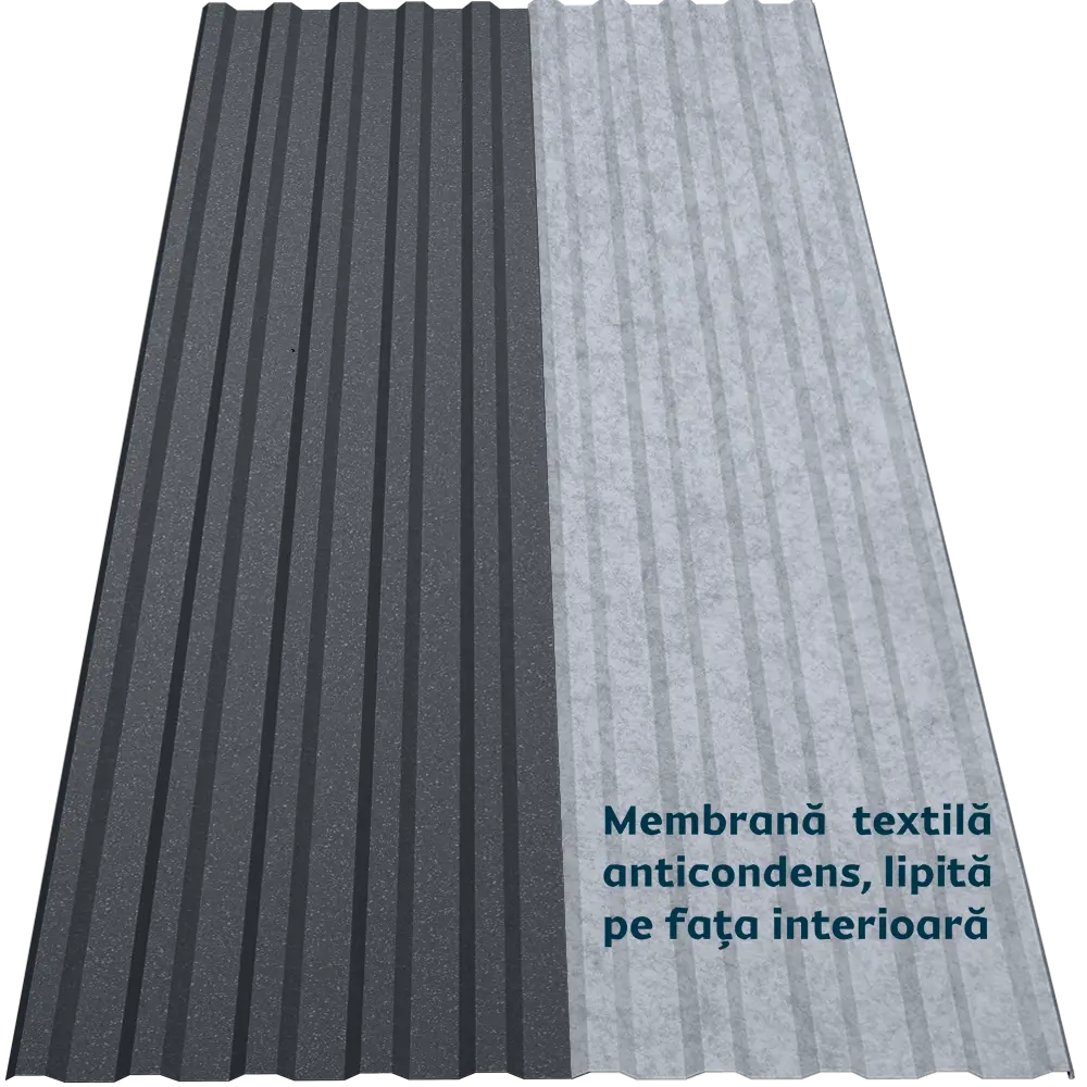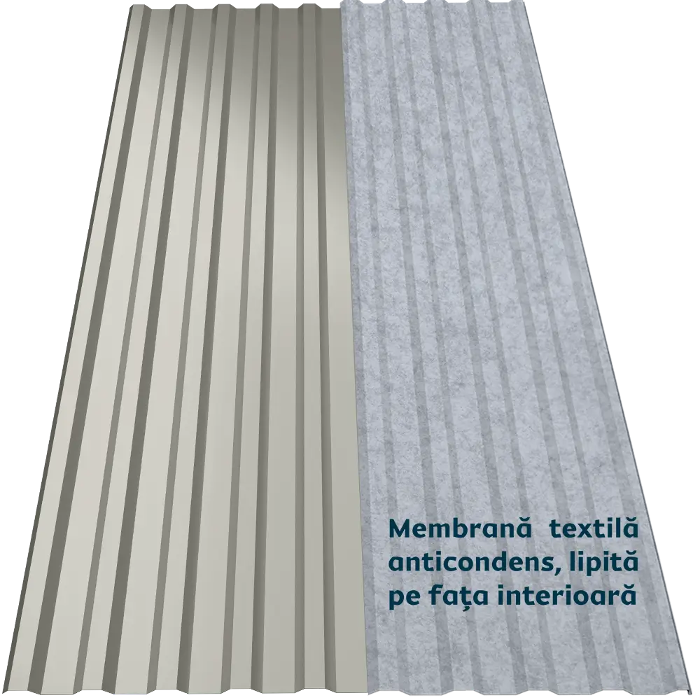 Tabla cutată CRT 20A Smart păstrează rezistența mecanică dată de profilul trapezoidal compact. Membrana textilă autoadezivă aplicată pe spate funcționează ca o folie anticondens, reținând umezeala și eliminând-o treptat prin evaporare. În plus, îmbunătățește izolarea termică și fonică, este ignifugă și tratată special pentru a preveni apariția bacteriilor și mucegaiului.