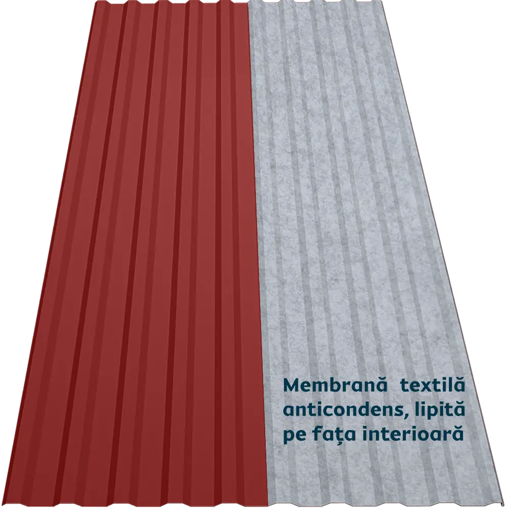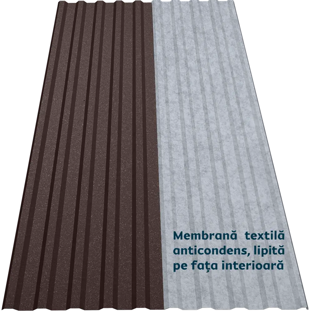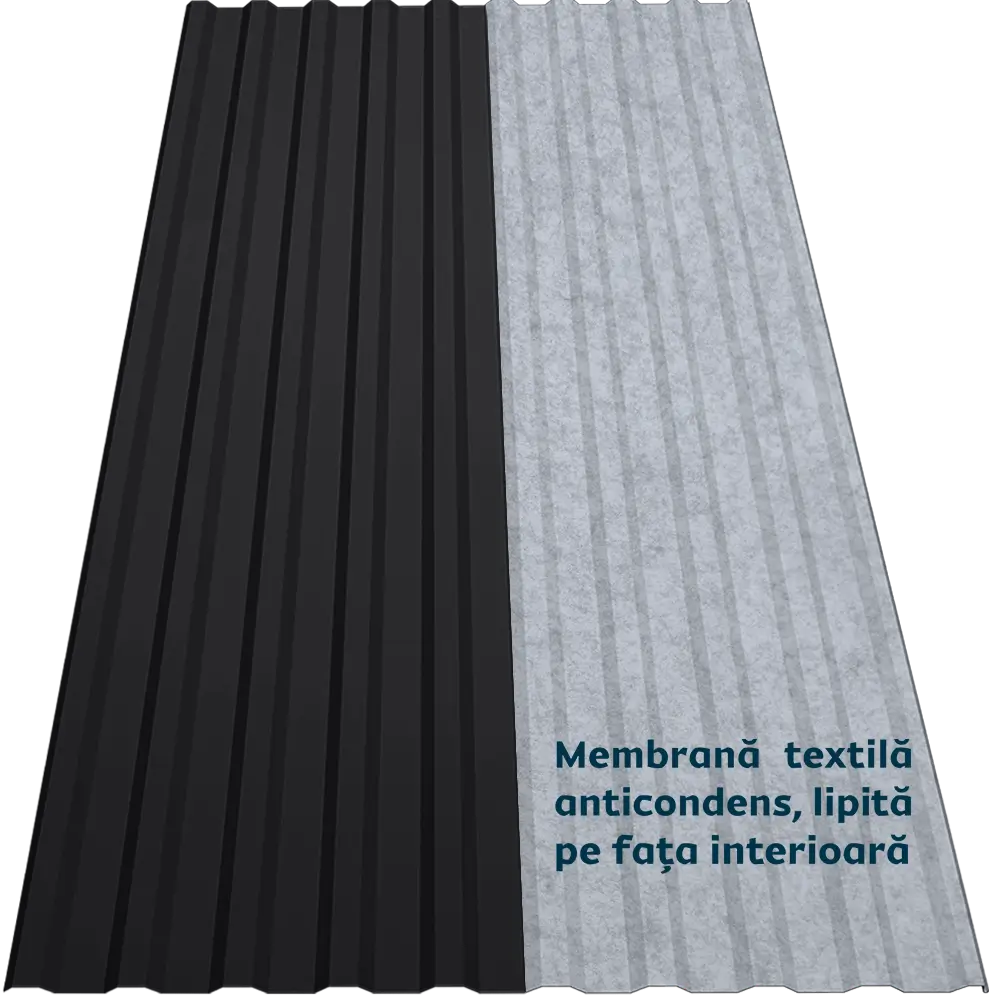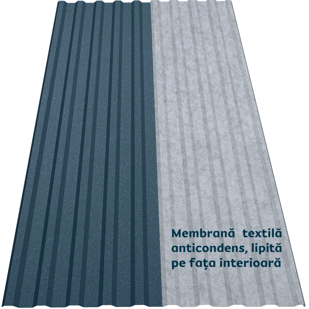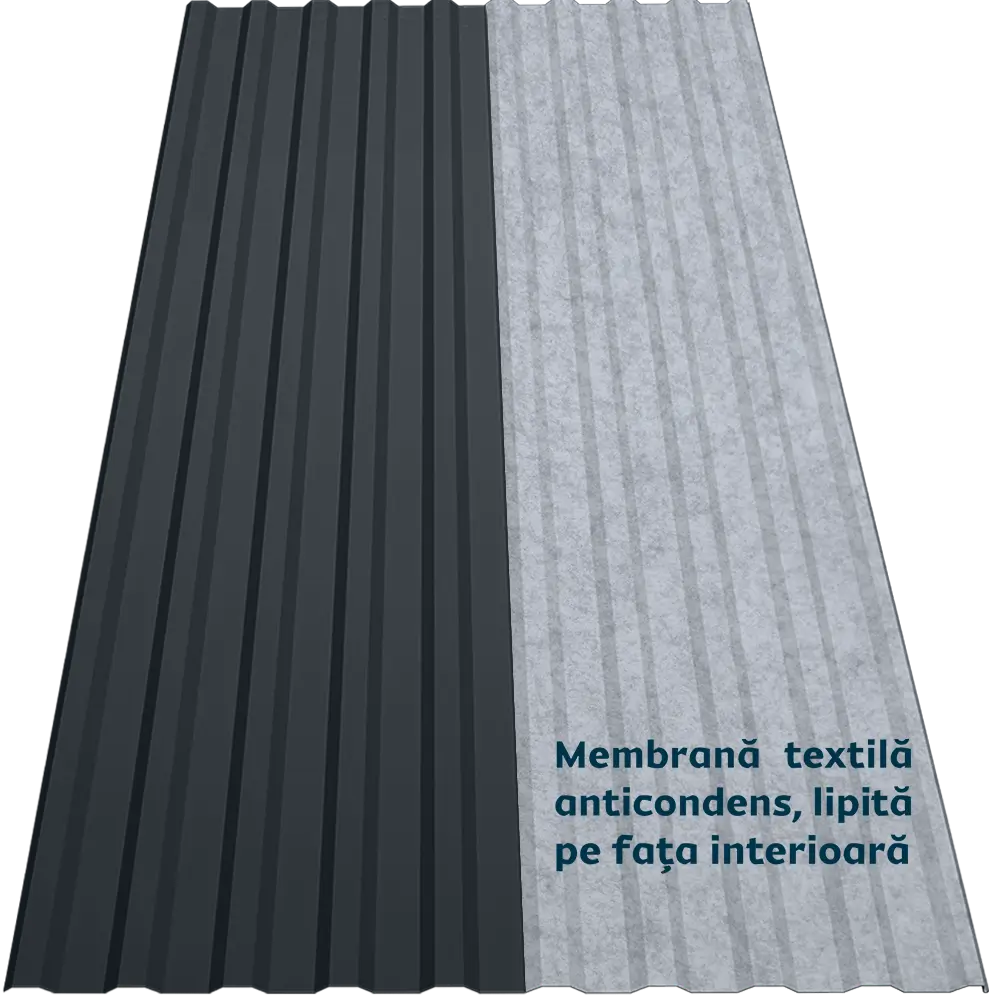 Tabla cutată CRT 20A Smart păstrează rezistența mecanică dată de profilul trapezoidal compact. Membrana textilă autoadezivă aplicată pe spate funcționează ca o folie anticondens, reținând umezeala și eliminând-o treptat prin evaporare. În plus, îmbunătățește izolarea termică și fonică, este ignifugă și tratată special pentru a preveni apariția bacteriilor și mucegaiului.