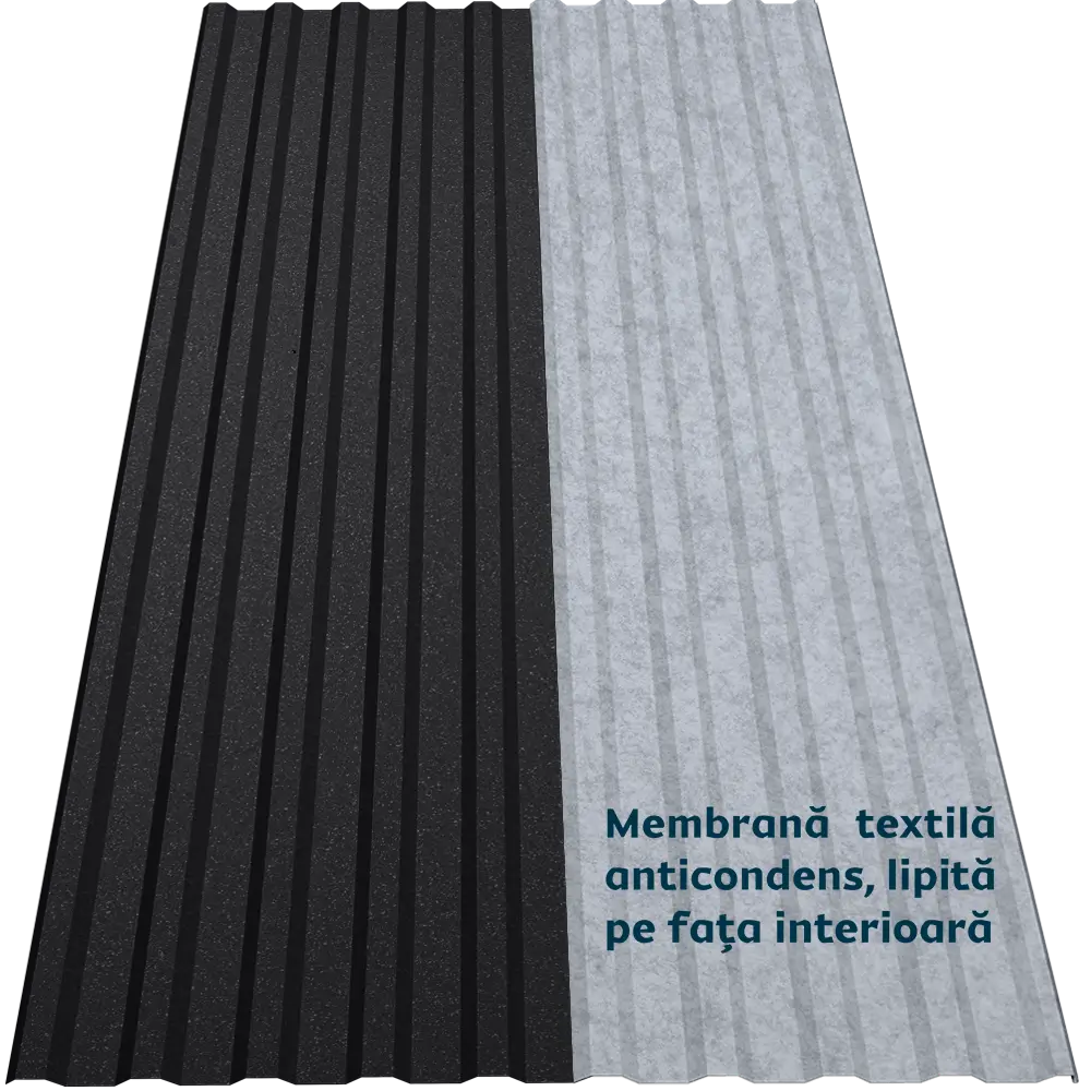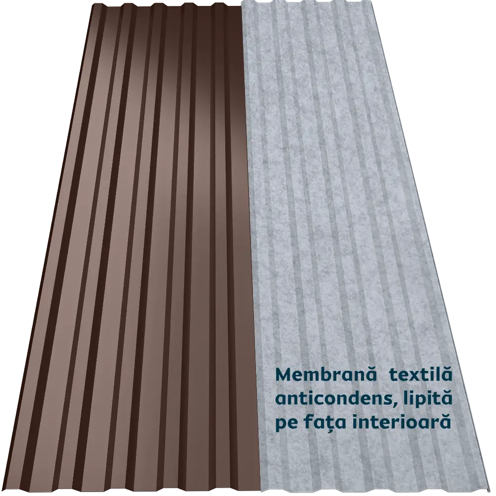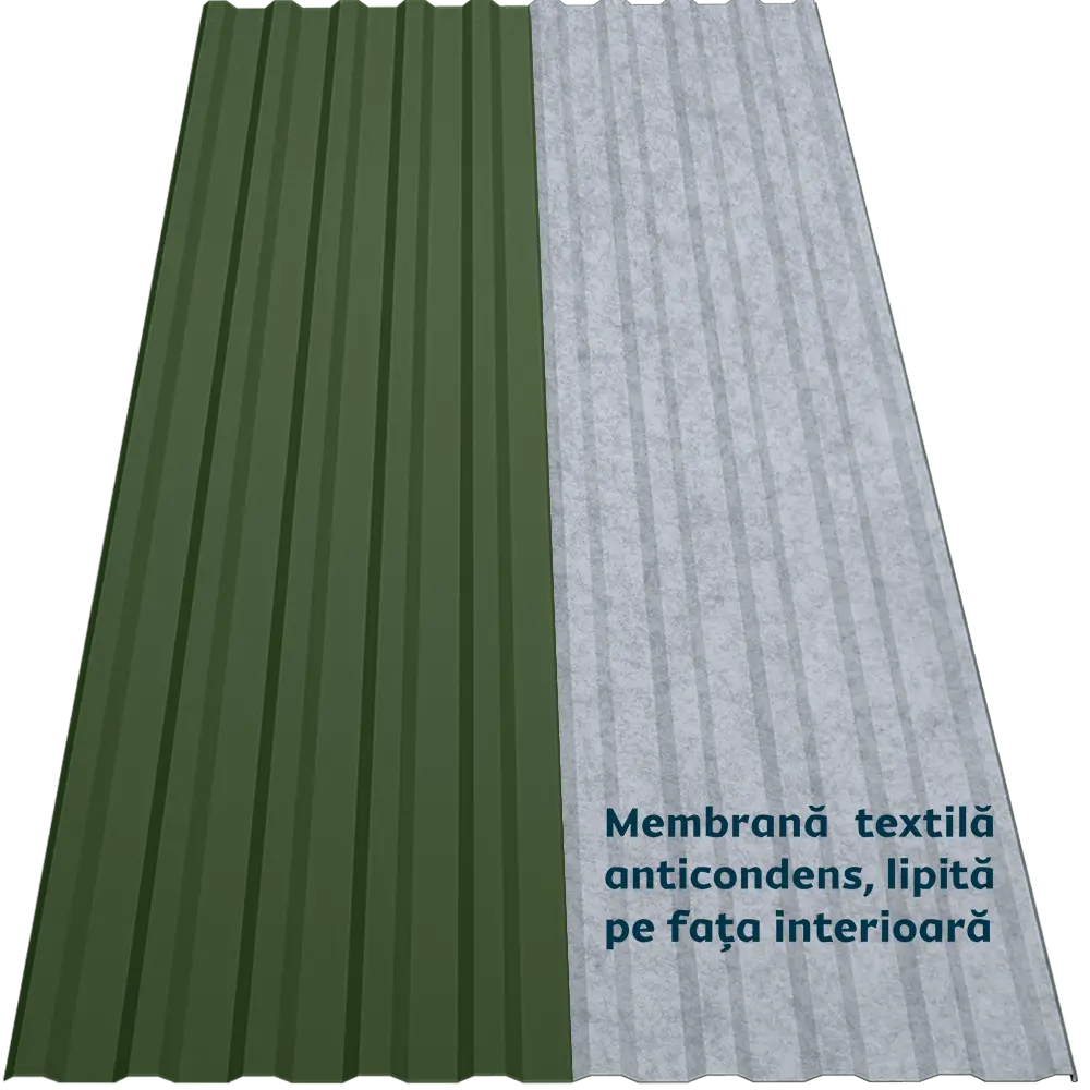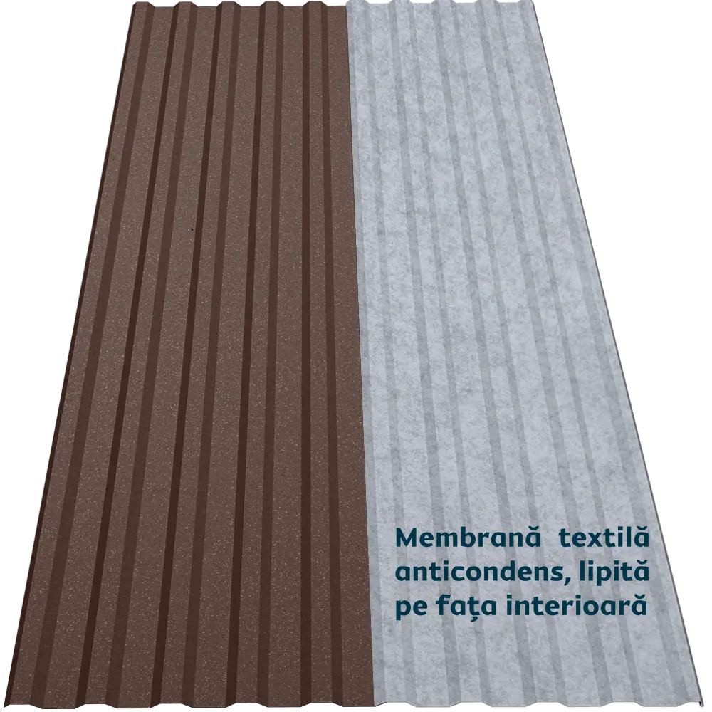 Tabla cutată CRT 20A Smart păstrează rezistența mecanică dată de profilul trapezoidal compact. Membrana textilă autoadezivă aplicată pe spate funcționează ca o folie anticondens, reținând umezeala și eliminând-o treptat prin evaporare. În plus, îmbunătățește izolarea termică și fonică, este ignifugă și tratată special pentru a preveni apariția bacteriilor și mucegaiului.