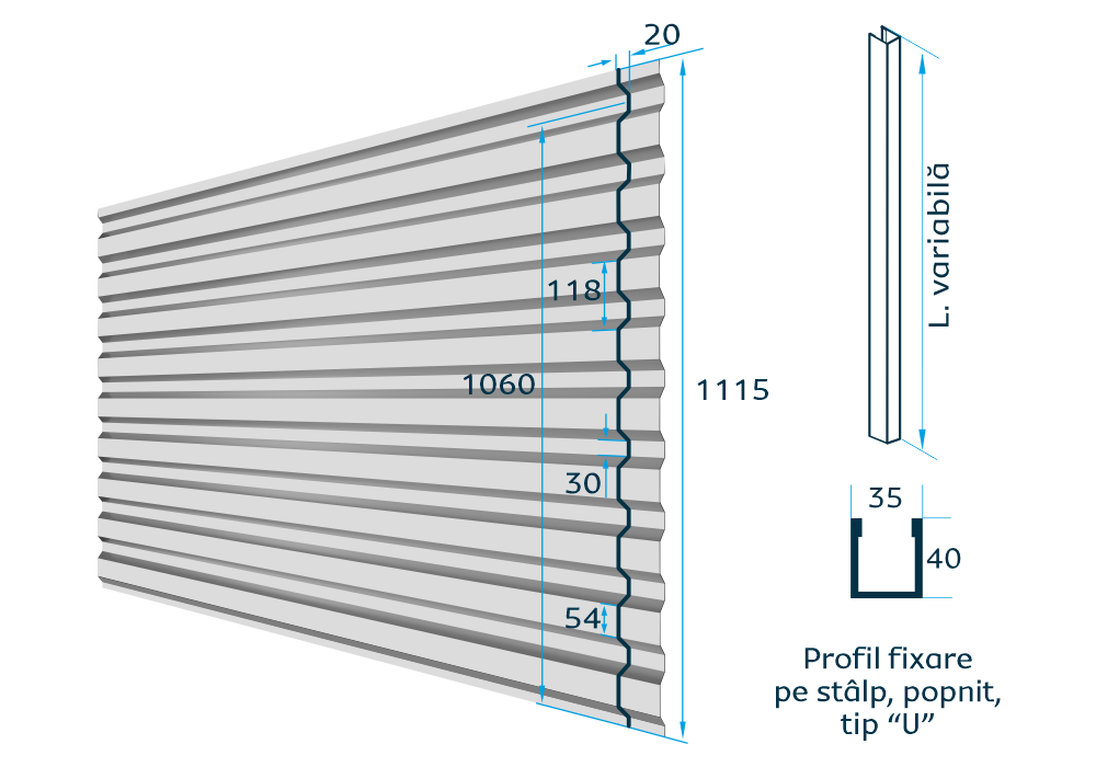 Fixare pe stâlp: profil metalic tip „U” de 20 mm.