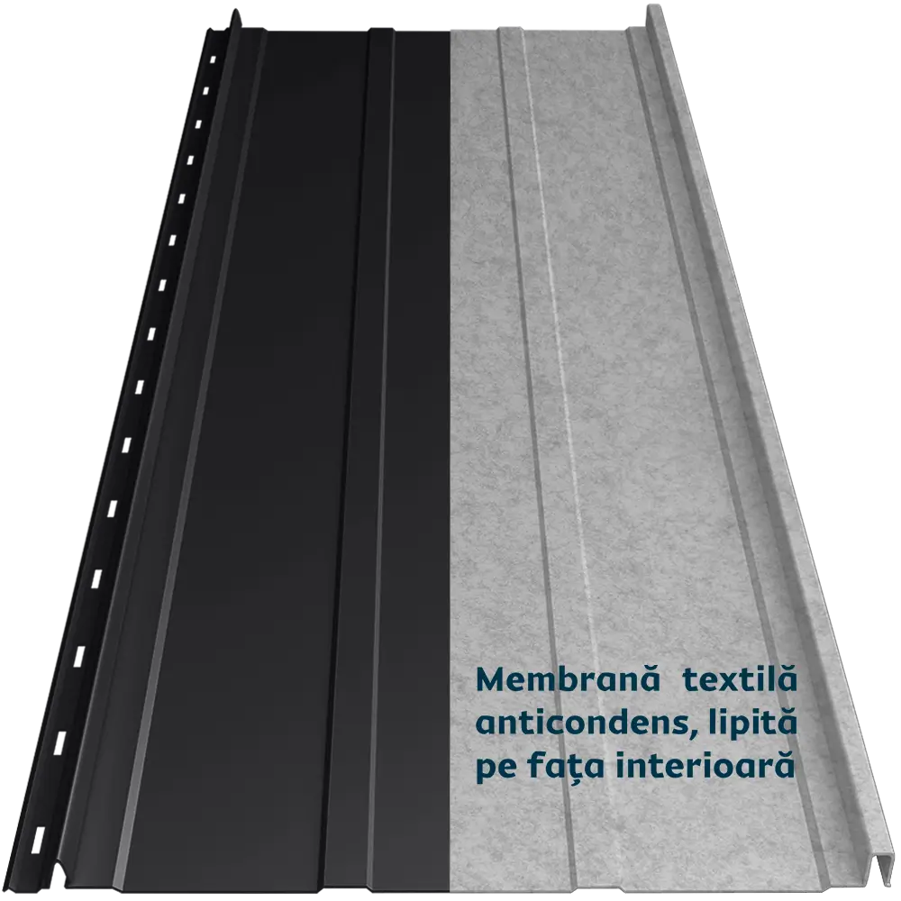 Panoul de tablă prefălțuită Canto Nervurat Smart se distinge prin nervuri longitudinale, care îi oferă rigiditate și un aspect echilibrat. Membrana textilă anticondens aplicată pe spate previne condensul și îmbunătățește confortul termic și fonic al acoperișului. Este ignifugă și tratată antibacterian. Îmbinarea ușoară prin clipsare maschează găurile de prindere pe lemn și face montajul ușor.