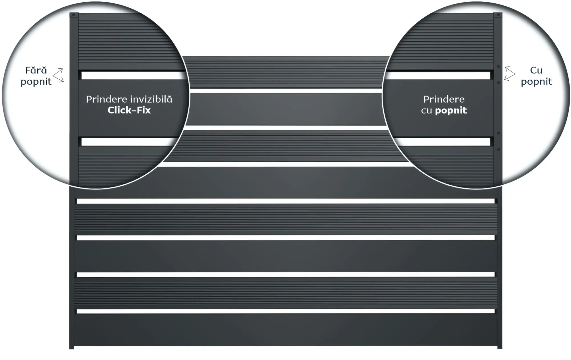 Gardul tip casetă x120 Mixt îmbină un profil plat pe o față și unul nervurat pe cealaltă, oferind un design original și versatil, potrivit atât pentru locuințe moderne, cât și pentru spații comerciale.Panourile se pot monta în două variante de prindere ce utilizează profile de fixare pe stâlp tip „U”: