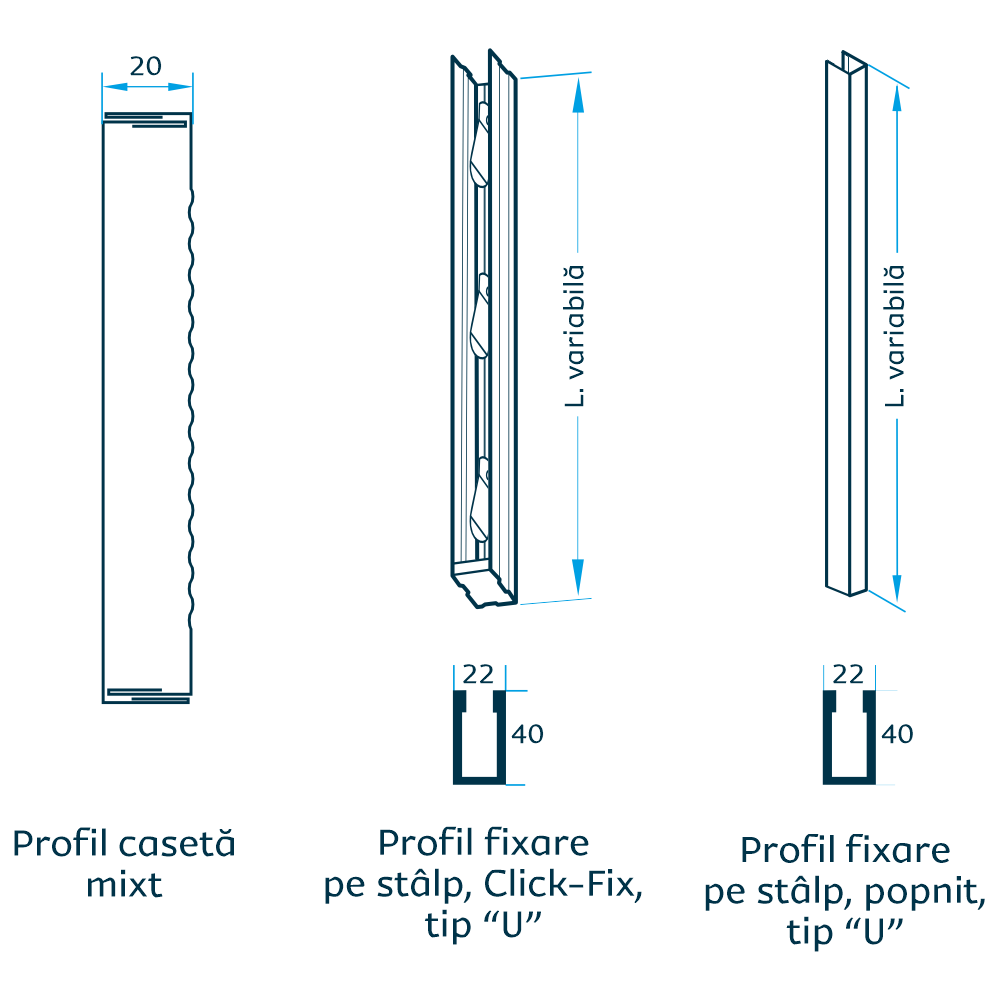 | Profil de fixare pe stâlp popnit, de 20 mm, tip „U”, stânga/dreapta | 22×40 mm (l x h) |