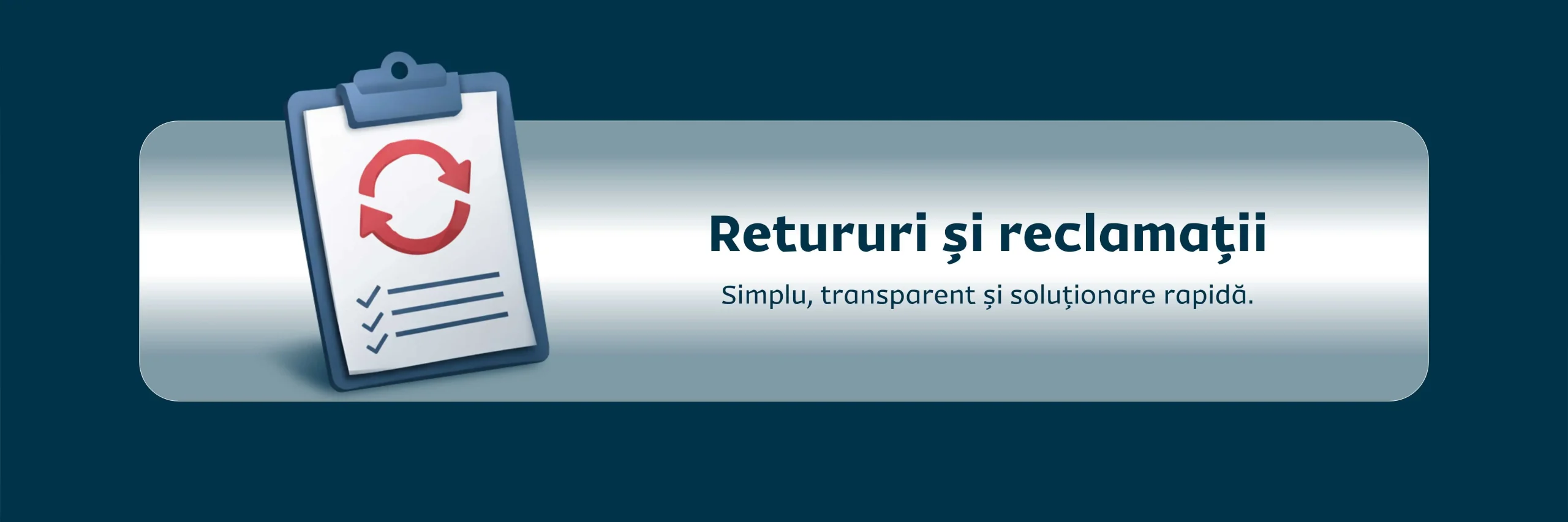 Ne dorim ca fiecare comandă să fie exact așa cum te aștepți. Dacă apar situații neprevăzute, ai la dispoziție un proces simplu și transparent pentru retur sau reclamații. Aici găsești toate informațiile necesare despre politica de retur, împreună cu formularele de retur și reclamații, pentru o soluționare rapidă și corectă.